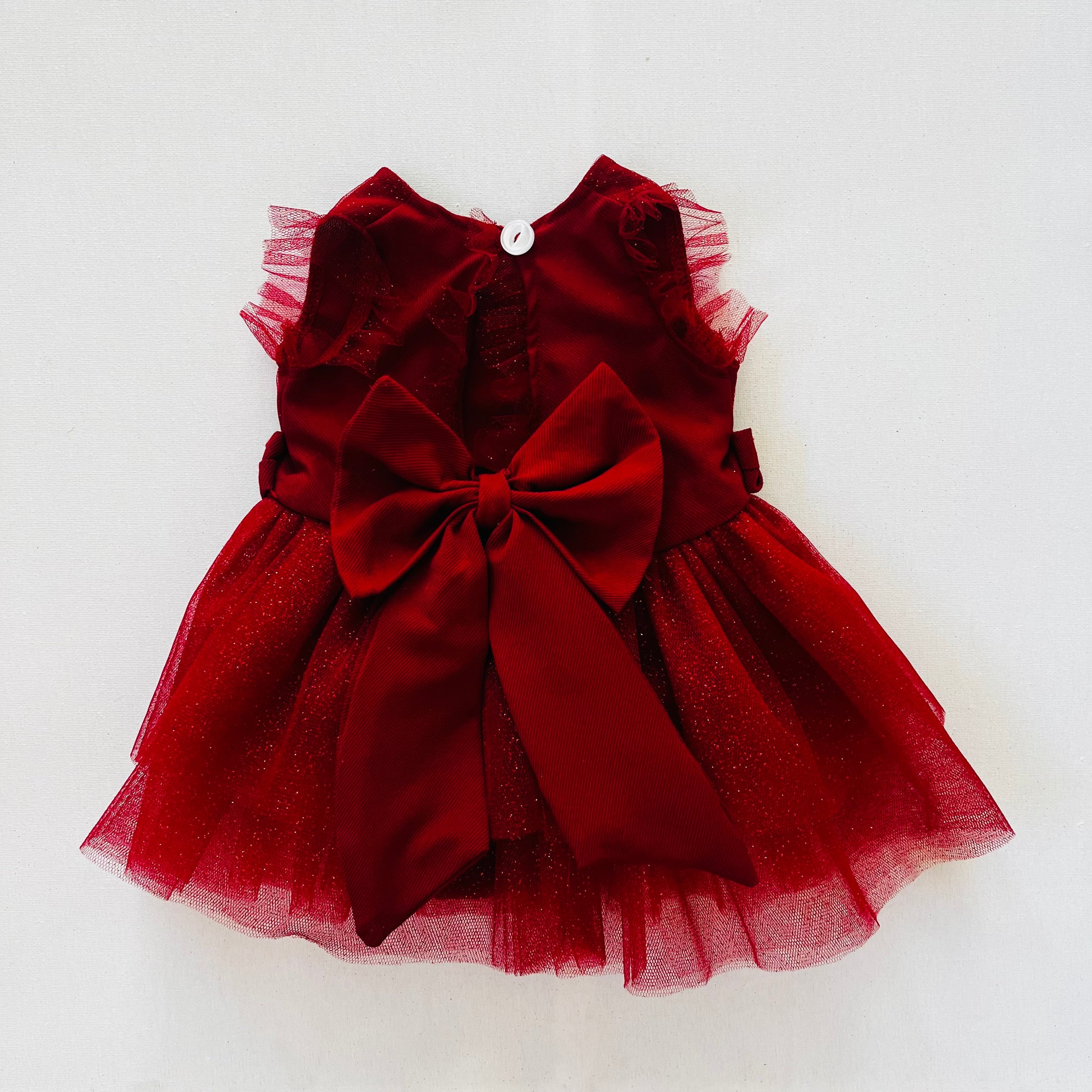 The ultimate Christmas dress for little girls. This dress has glittering layers of tulle and is fully lined. The big statement bow is detachable and can be put on the one side of the sleeve, or at the back or at the front. The v-backline is super cute and the dress comes with a complimentary knotted bow nylon headband.