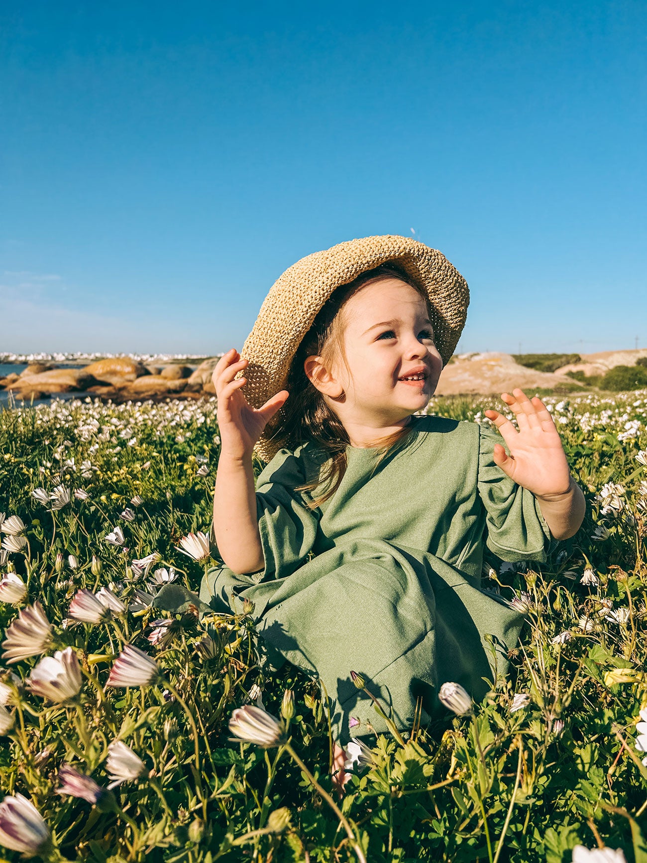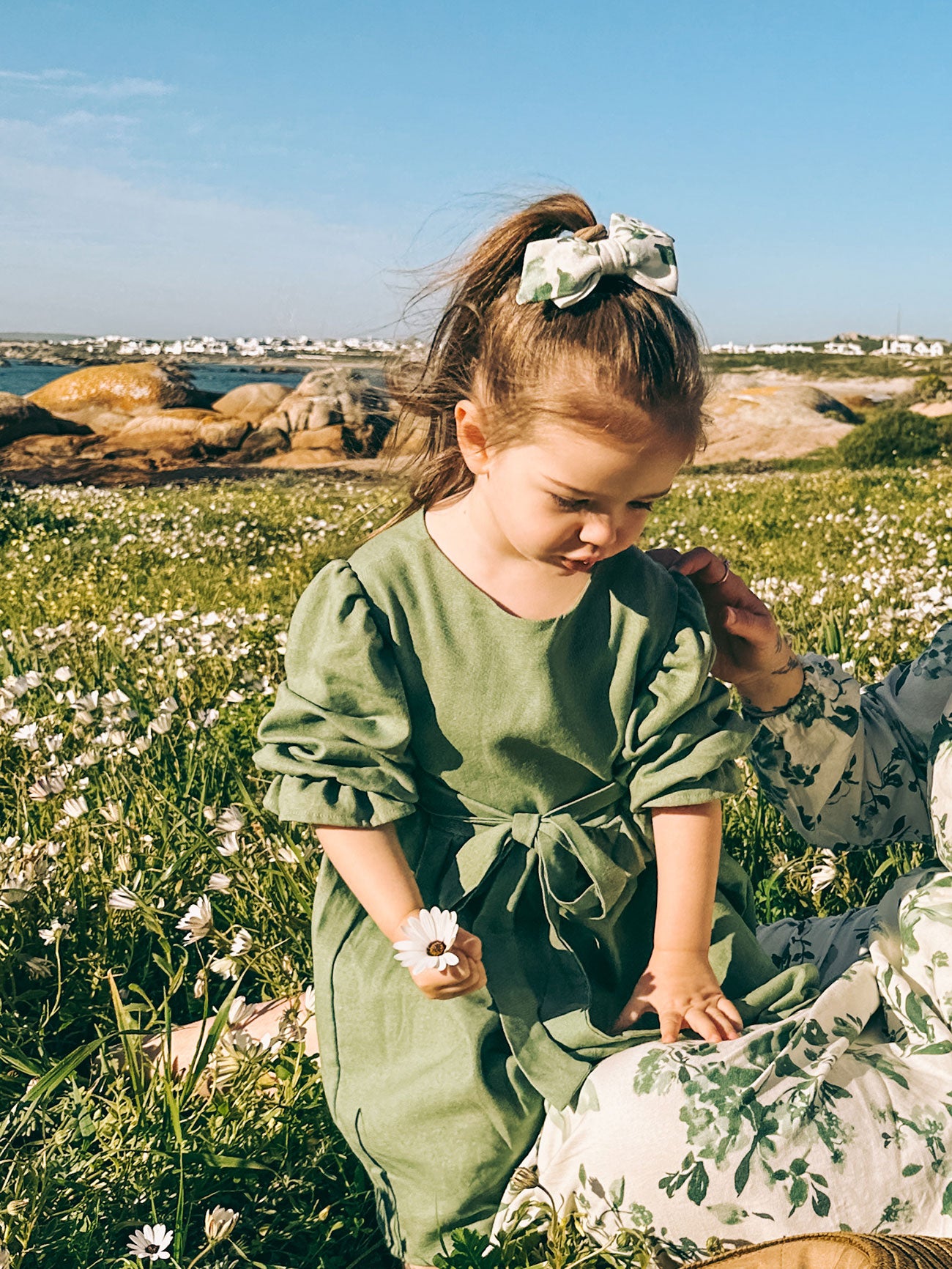 The Magnolia Dress features puffy long sleeves with frill detail around the wrist. It has buttons at the back for easy dressing. Finished with a belt around the waist that ties into a bow to the front or back.
