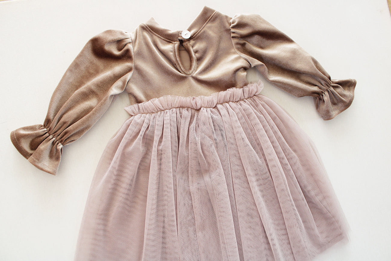 This gorgeous Dress for girls features puffy long sleeves with frill detail around the wrist. It has buttons at the back for easy dressing. Gathered Tulle A-line skirt thats fully lined. Pair with the matching accessories for a cute winter outfit. *matching mommy outfit available