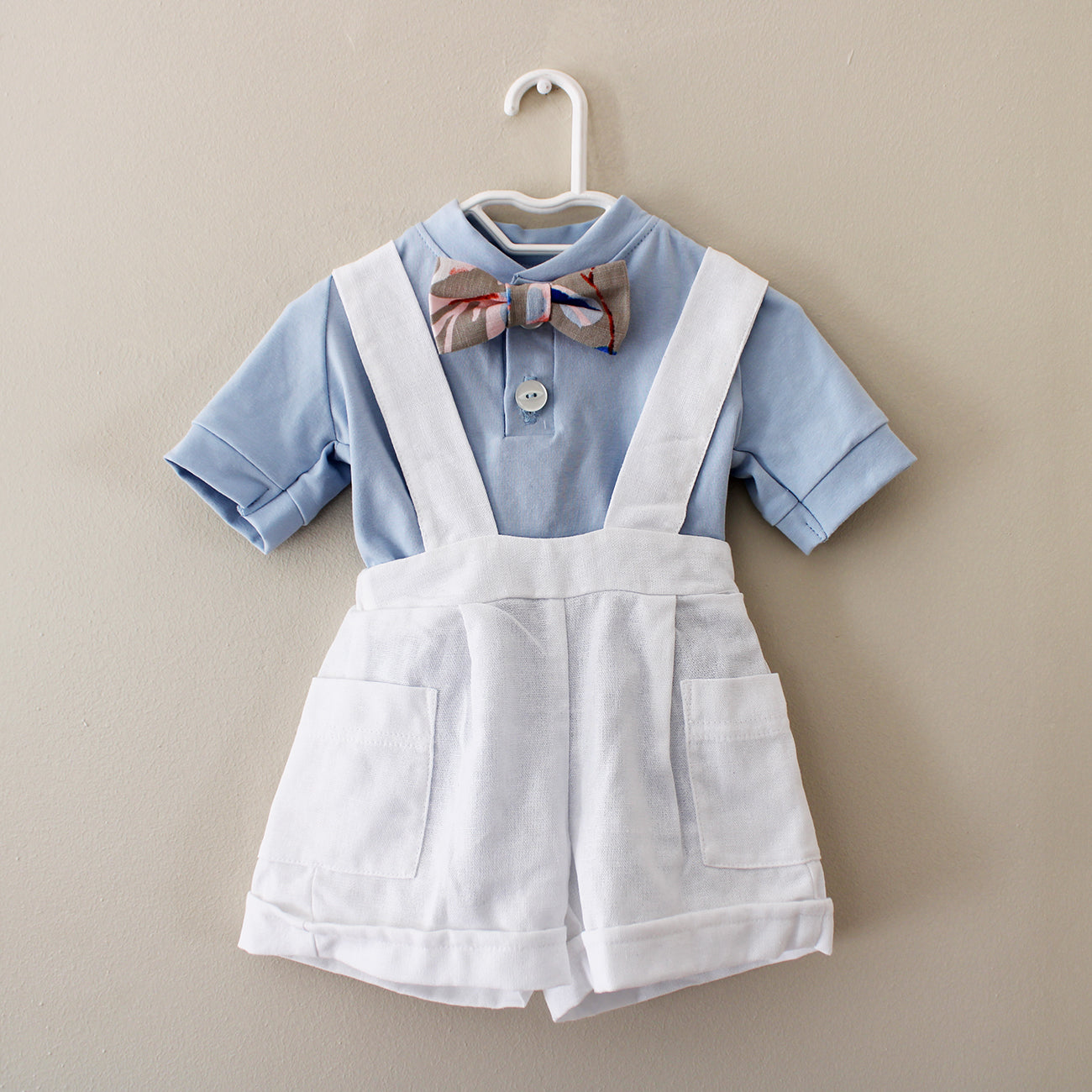 Collared Onesie with short sleeves and press studs at the bottom for easy diaper changing. Pair with any of our suspender pants and bow ties to complete the look.